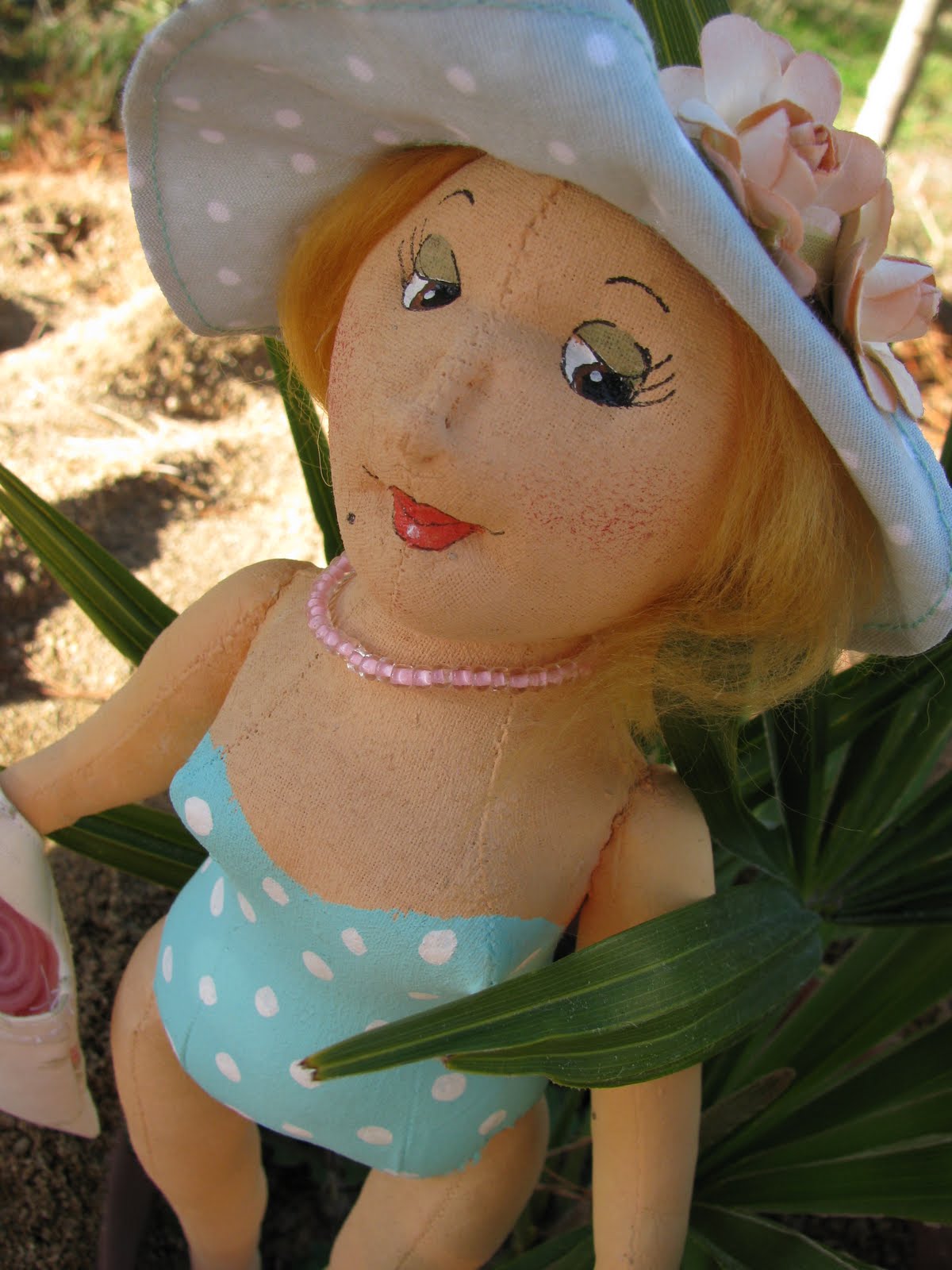 Evalla upea vaaleanpunainen rantahattu valkoisin pilkuin. Huomaa hänen ihanat kukkaballeriinansa ensimmäisessä yhteiskuvassa!